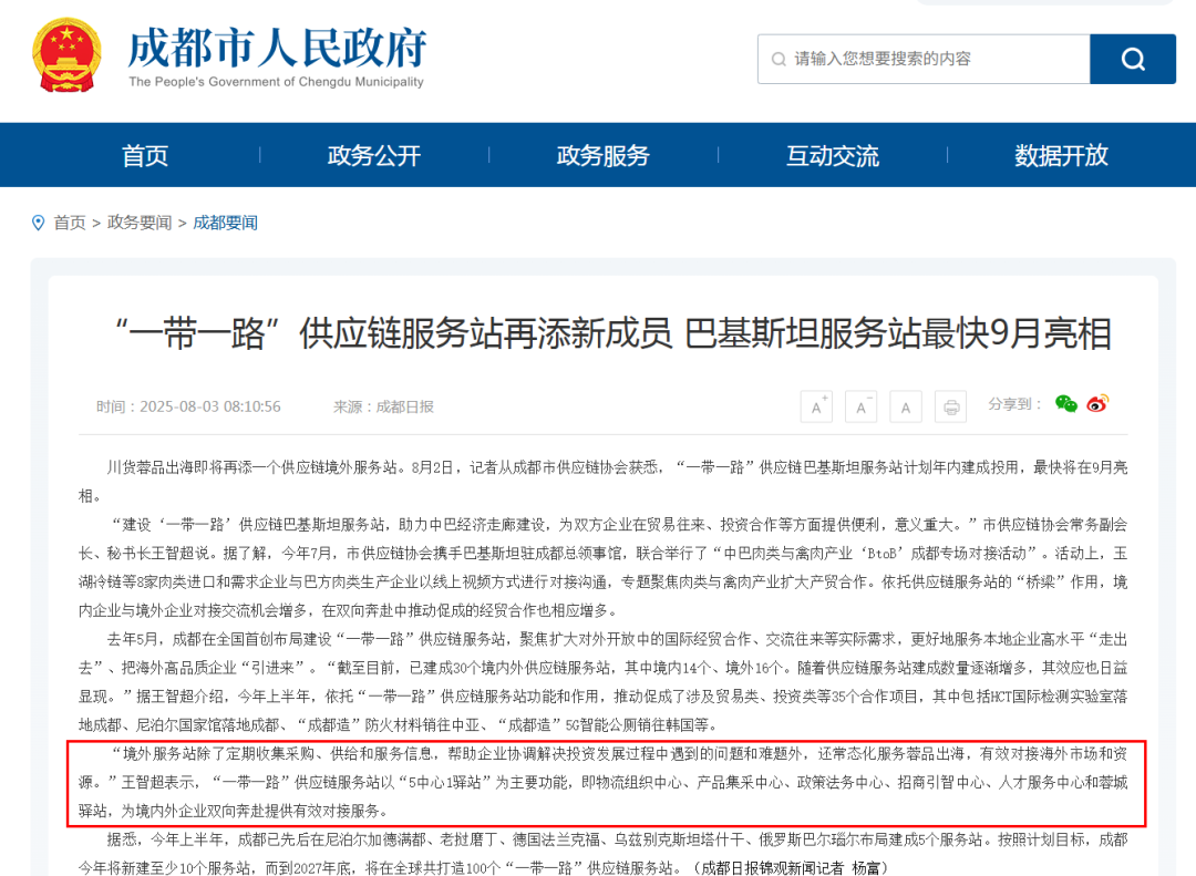 据悉,今年上半年,成都已先后在尼泊尔加德满都、老挝磨丁、德国法兰克福、乌兹别克斯坦塔什干、俄罗斯巴尔瑙尔布局建成5个服务站。按照计划目标,成都今年将新建至少10个服务站,而到2027年底,将在全球共打造100个“一带一路”供应链服务站。