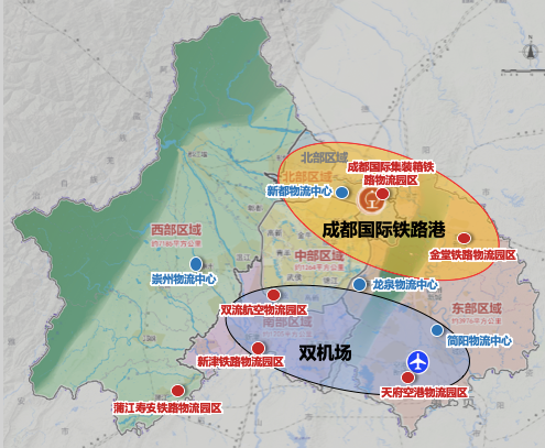 在城市南部建设以双机场为核心的航空大港区,实现空陆物流节点(天府空港物流园区、双流航空物流园区、新津铁路物流园区、简阳物流中心)一体化集群发展。