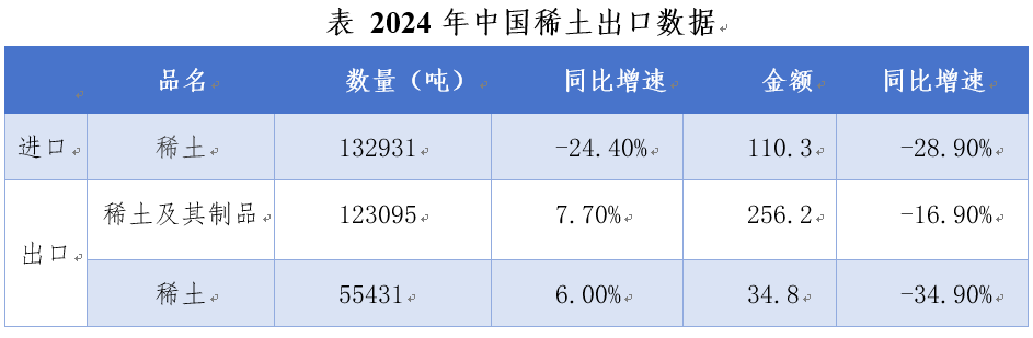 2024年中国稀土出口数据凸显其全球市场主导地位:全年出口稀土原料5.54万吨(同比增长6%),虽出口额34.8亿元同比下降34.9%,但62.71元/公斤的出口均价仍保持竞争力;稀土及其制品总出口量达12.31万吨(增长7.7%),创256.2亿元出口额。细分领域显示,稀土化合物出口4.65万吨(增长8.57%)但均价下滑28.96%至51.36元/公斤,而稀土金属出口量减少5.88%至8895.8吨,其均价更骤降58.93%至75.85元/公斤,反映出全球市场波动下的结构性调整,但中国仍通过完整的产业链维持着全球稀土供应链的核心地位。