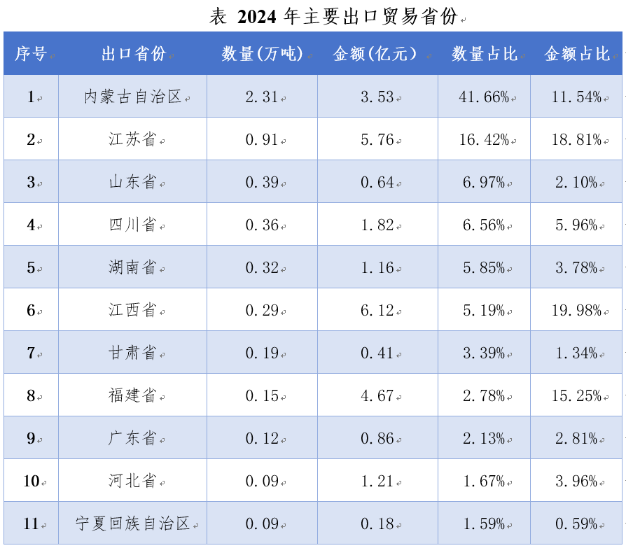 从主要出口贸易省份来看,内蒙古凭借其丰富的矿产资源优势,在稀土出口数量上占比最高;江苏省则依托通道口岸和产业链优势,在稀土出口金额方面表现突出,占据重要地位。