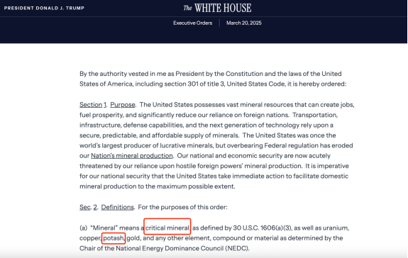 ▲ 图 2025年3月,特朗普总统签署行政命令将钾盐与铜、铀、黄金并列为国家重点支持的关键矿产