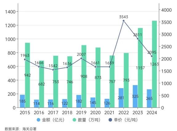 近十年,我国钾肥进口呈稳定增长态势,进口量年均增长3.31%。2023年1月1日起,我国对氯化钾、硫酸钾等钾肥实施零关税。2023年以来,我国进口氯化钾连续两年进口突破千万吨。2024年我国钾肥总进口数量达到1263.15万吨,总进口金额为264.58亿元,进口依存度高达67.45%。
