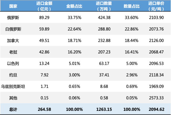 从贸易格局来看,2024年我国钾肥进口主要来源国为俄罗斯、白俄罗斯、加拿大和老挝,进口金额合计241.55亿元,进口数量1153.3万吨,占比均为91.3%。