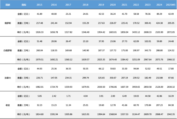 2024年,中国与白俄罗斯钾肥贸易大幅回落至288.8万吨,进口趋势受地缘政治和运输限制影响较大。加拿大是我国钾肥进口的长期供应国,在2020年进口量达到峰值,2023年降至182.49万吨,2024年略有回升。2025年1-5月,进口钾肥562.96万吨,与上年同期持平。