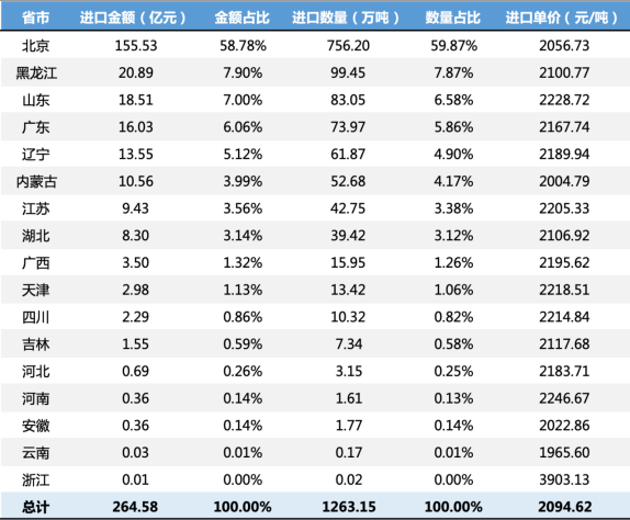 从主要进口贸易省市来看,北京的进口金额和数量均遥遥领先,分别占全国总量的58.78%和59.87%,主要得益于大型贸易公司、国企的总部设在北京,负责全国的钾肥采购和分销业务。黑龙江、辽宁的进口量和金额排名靠前,与东北地区是我国重要粮食主产区高度相关,农业生产对钾肥需求量大,中欧班列铁路运输便利。山东和广东沿海港口资源便于海运进口。