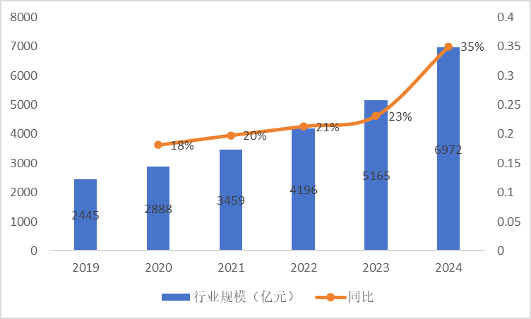 预制菜产业目前呈现出规模化增长与区域集聚的双轨发展模式。观察市场规模,预制菜展现出显著的扩张趋势。根据中智物流智库的调研数据,2024年,中国预制菜市场规模达到6972亿元,同比增长35%。从2019年的2445亿元增长至2024年的6972亿元,复合年均增长率达到23%。