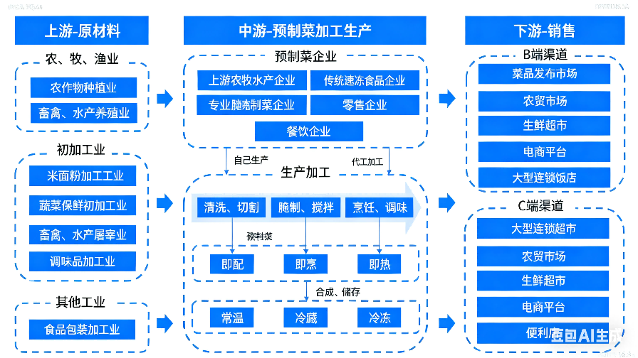 中国的预制菜产业链构成了一个高度整合的系统,涵盖了从上游原材料供应到中游加工制造,直至下游消费市场的全部环节。