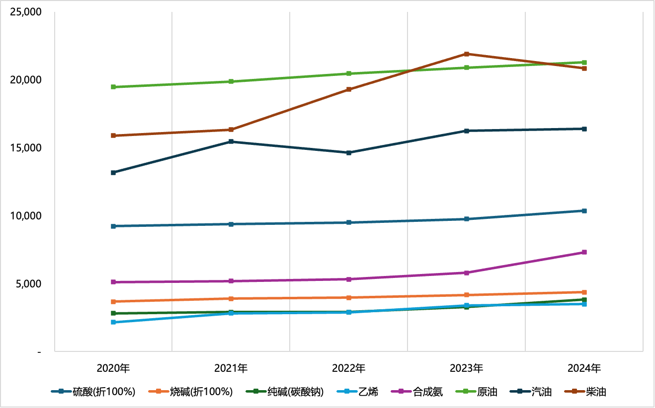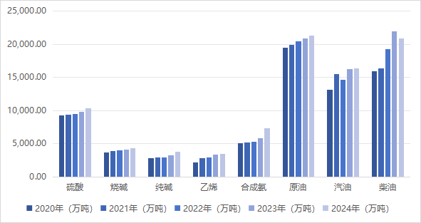 根据国家统计局数据,2024年我国主要危化品(含硫酸、烧碱、纯碱、乙烯、合成氨、原油、汽油和柴油)产量超8亿吨,同比增长2.79%,其中成品油产量始终占据较高位置。